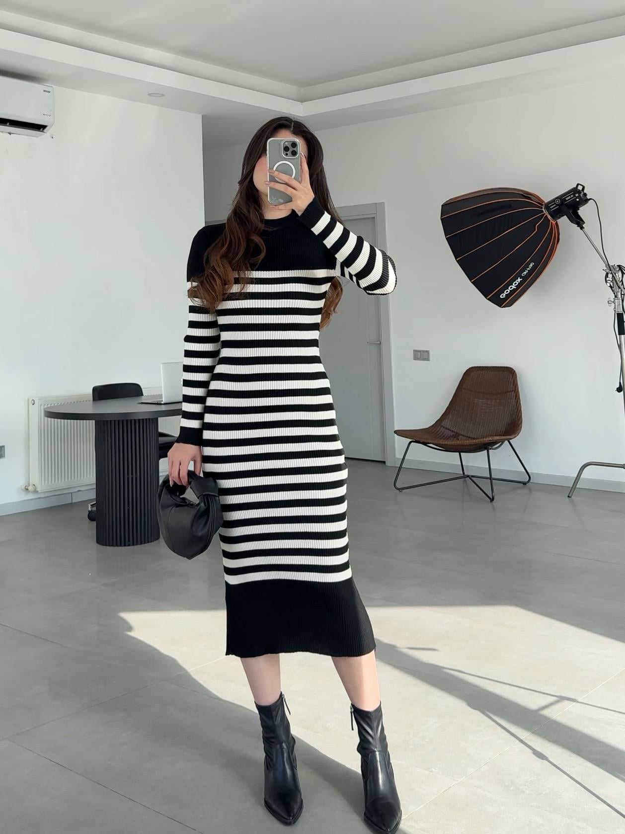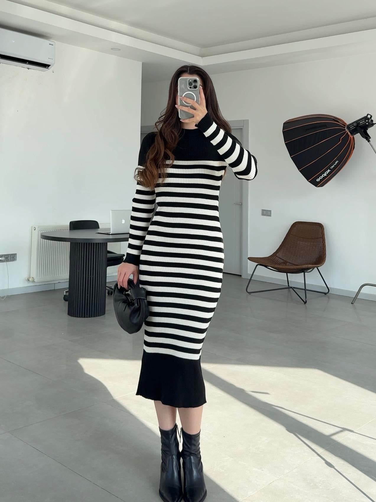 ÇİZGİLİ TRİKO ELBİSE- Siyah