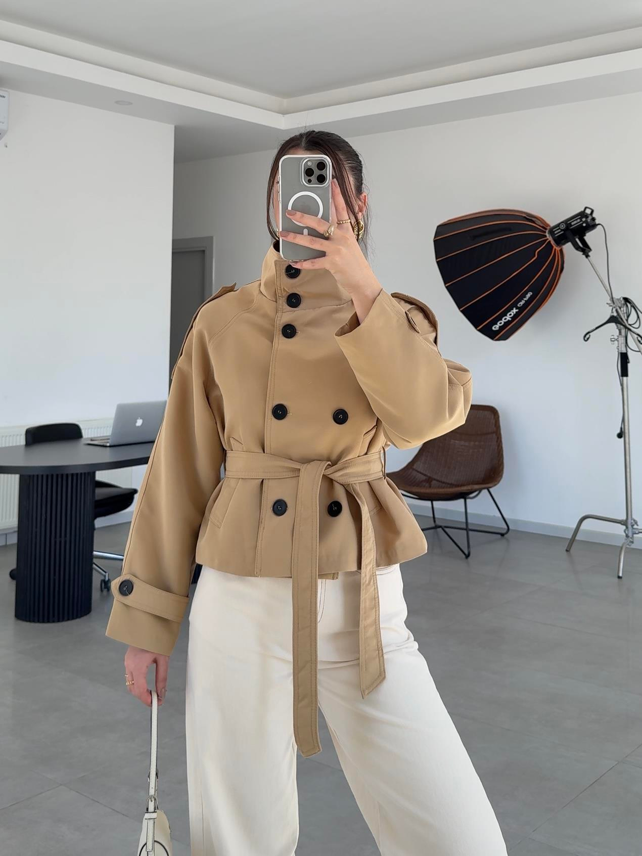 DİK YAKA KUŞAKLI KISA TRENÇKOT- Bej
