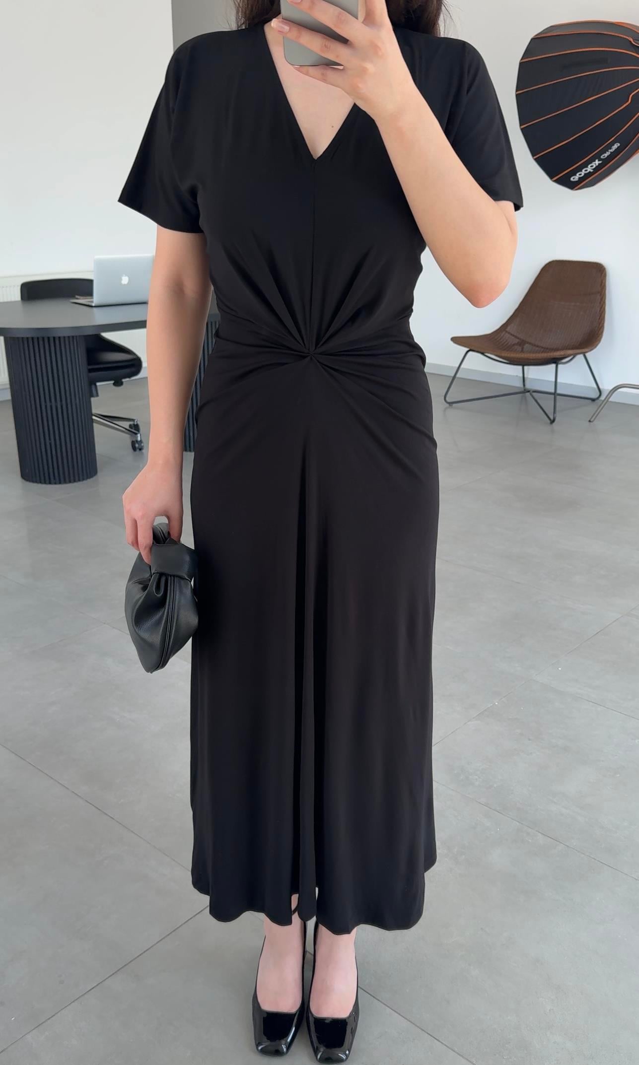KISA KOLLU, V YAKA, ÖNÜ BÜKÜM DETAYLI, UZUN MODAL ELBİSE NORMAL KALIP Model Ölçüleri : 175cm / 58kg Modelin Beden : S/36 Beden Ürün İçeriği : %70 Modal %30 Viskon Ürün Boyu : 135cm