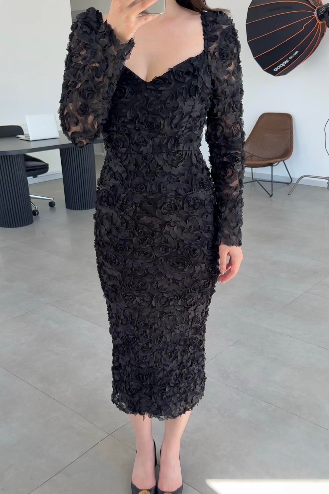 •  Çok Yüksek Kalite Dar kesim Ekru 3 Boyutlu Gül Desenli V Yaka Astarlı Midi Boy Premium Tasarım Elbise