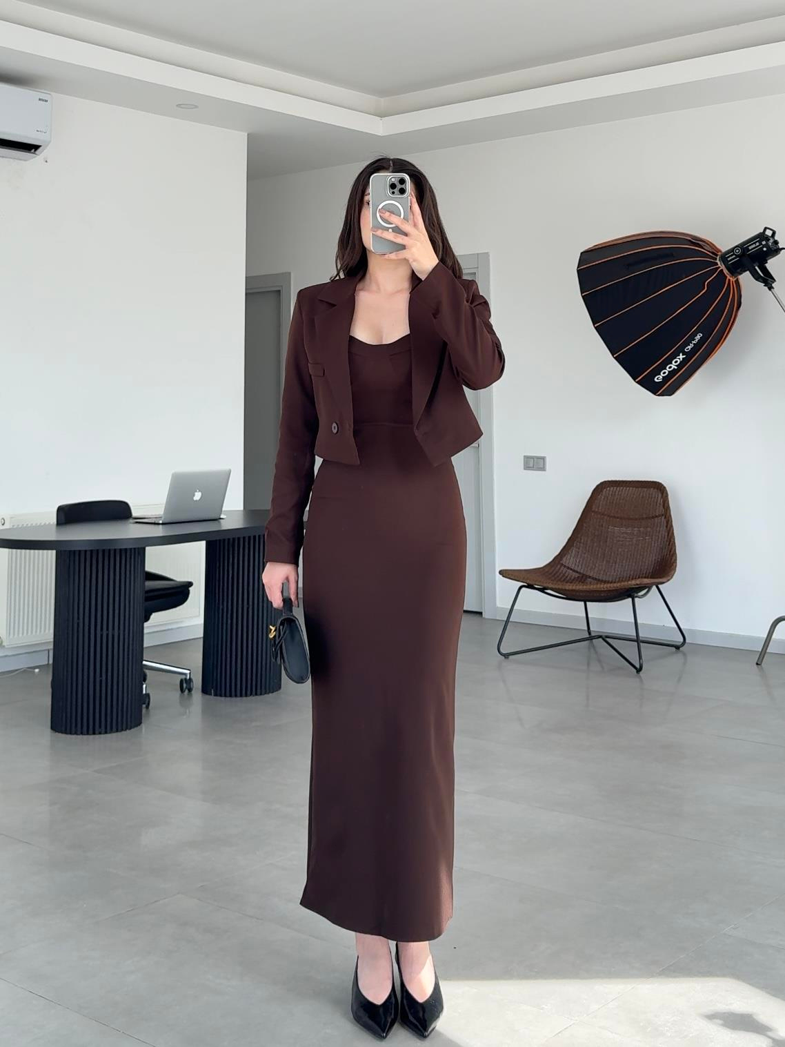 - Uzun kollu elbise ve kısa crop ceket kombinasyonu ile modern ve şık bir görünüm sunar.