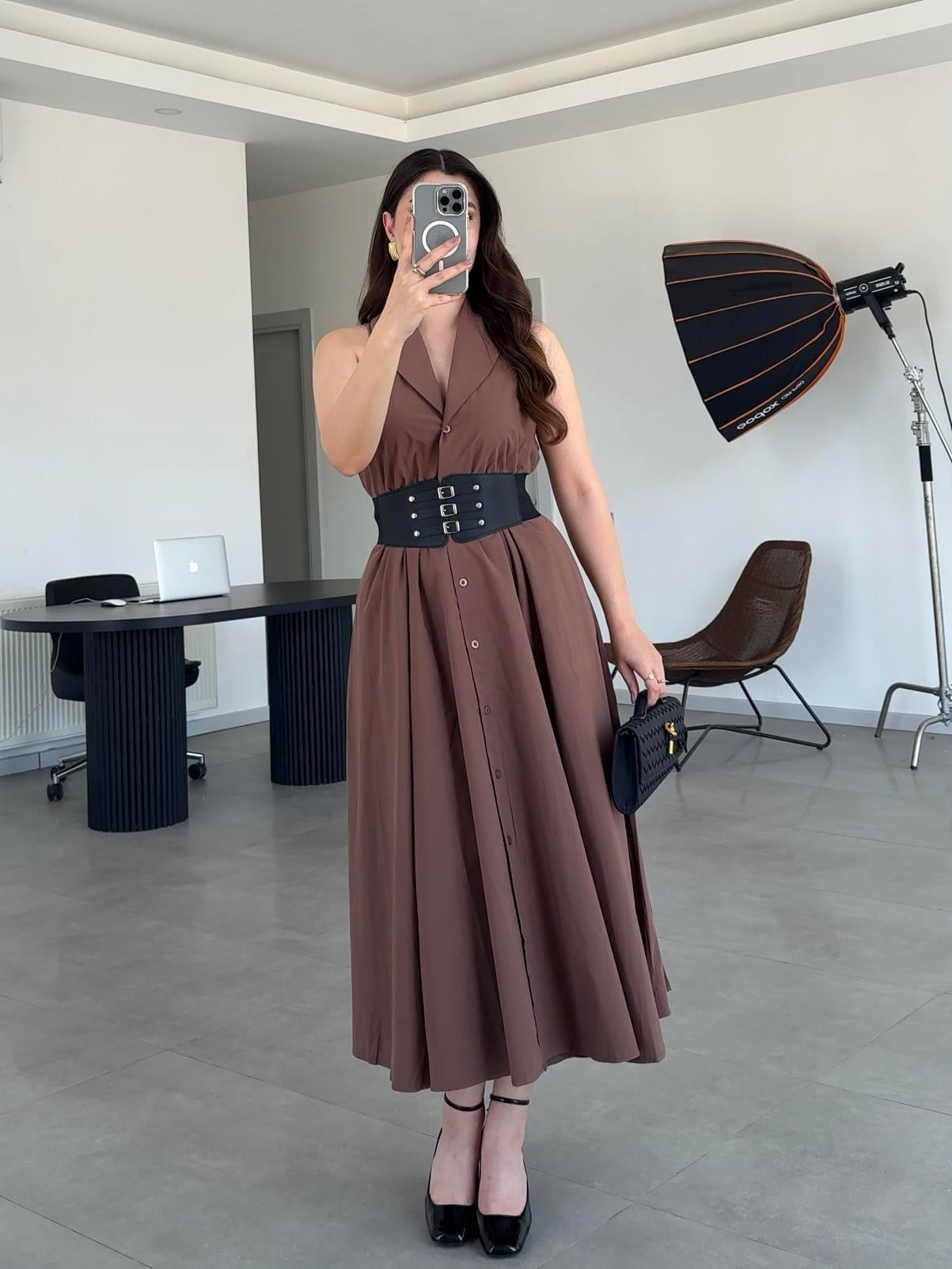 KAHVERENGİ KEMERLİ POPLİN MİDİ ELBİSE
