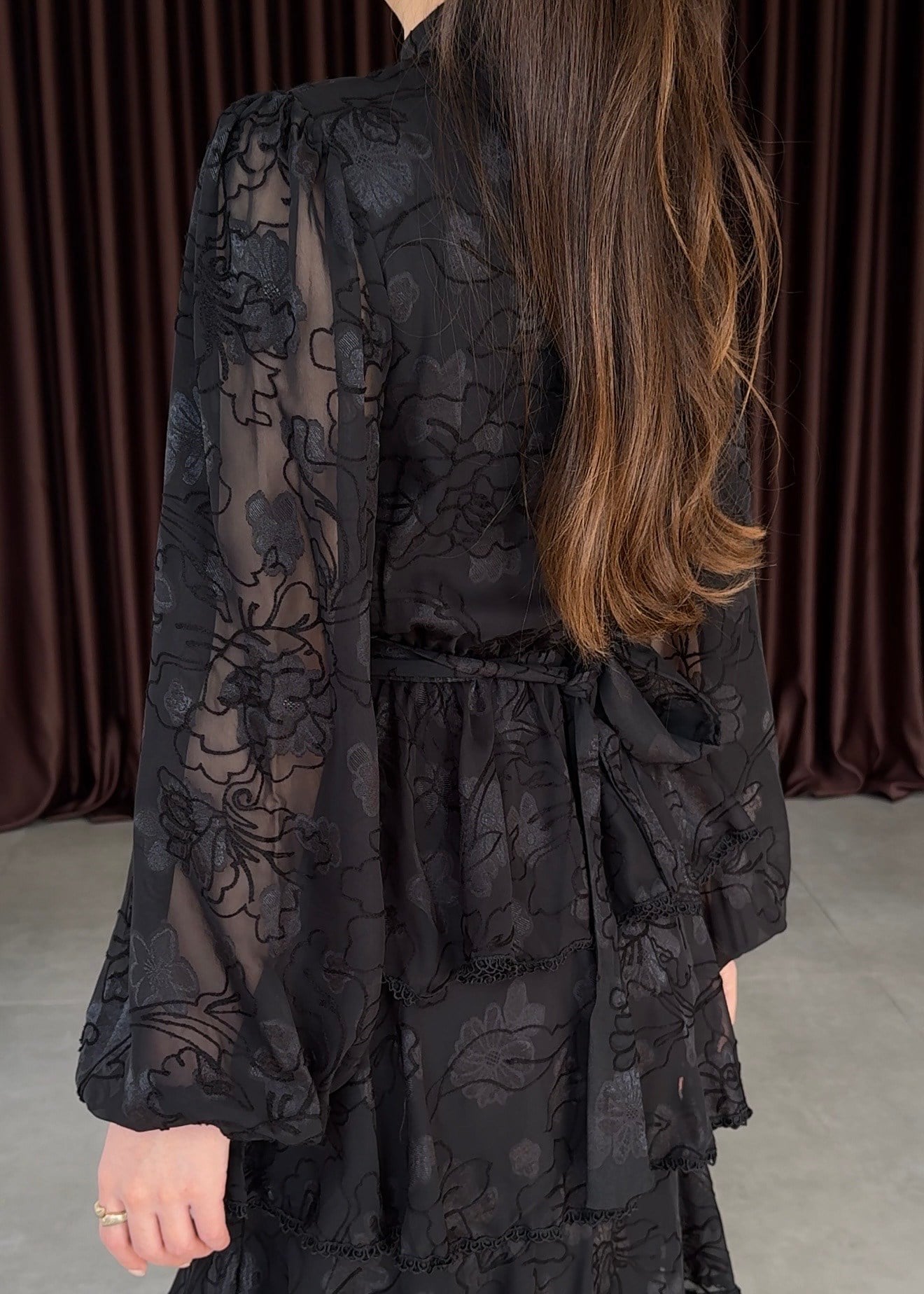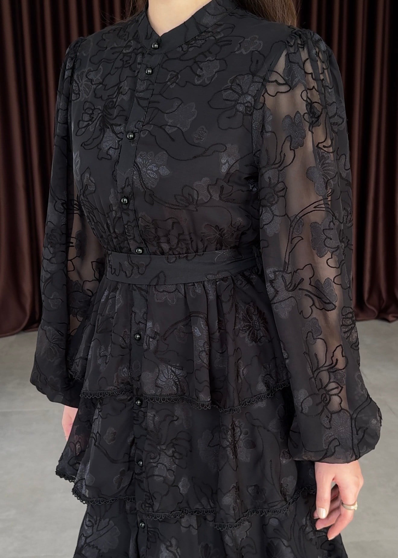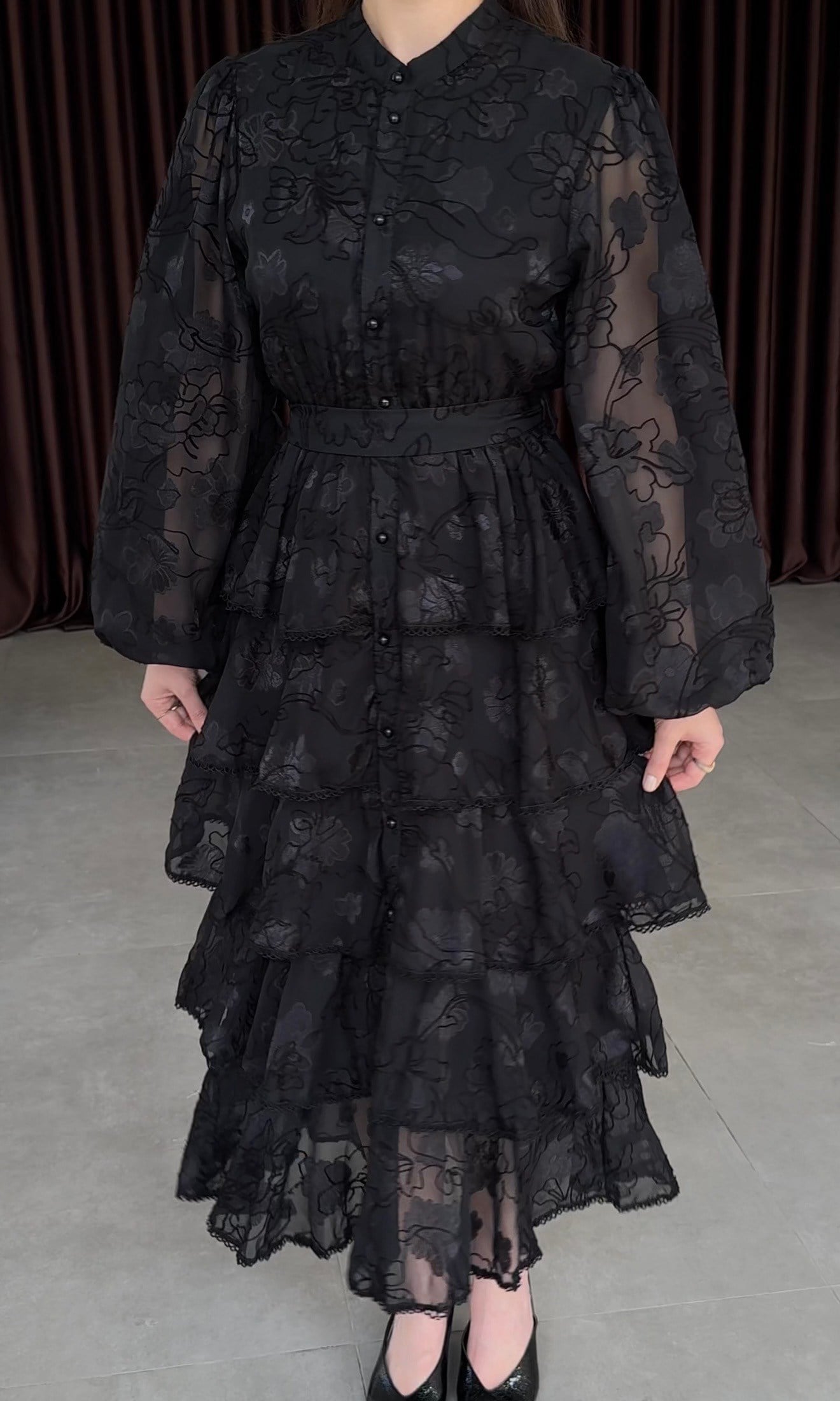 Romantik dokunuşları ve feminen silüetiyle öne çıkan bu elbise, özel günleriniz için zarif bir tercih sunar. Dantel kumaşı, floral desenleri ve kat kat etek yapısıyla asil bir görünüm kazandırır. Hakim yaka detayı ve ön kısmındaki düğmeler elbiseye nostaljik bir şıklık katarken, belden oturan kesimi vücut formunu dengeli şekilde ortaya çıkarır.