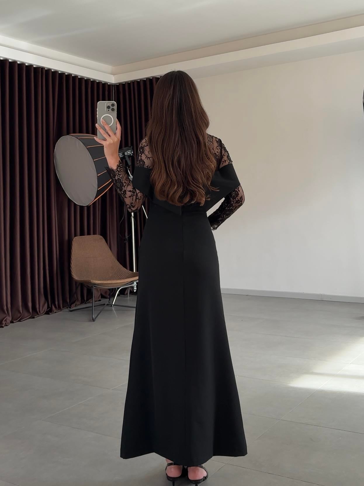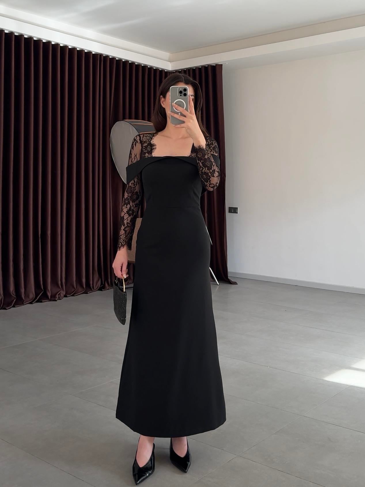 Kayık Yaka Kolları Dantelli Elbise- Siyah