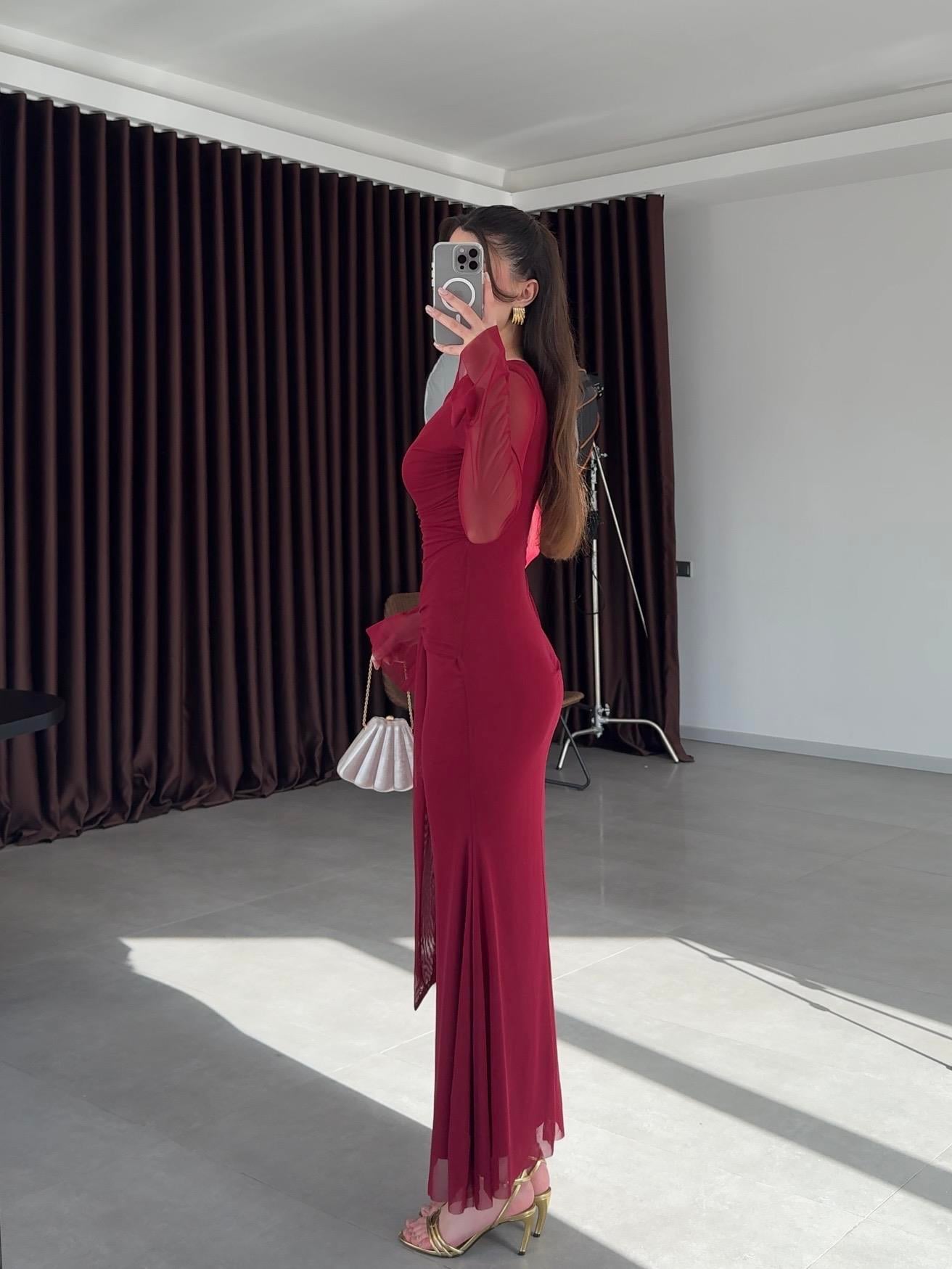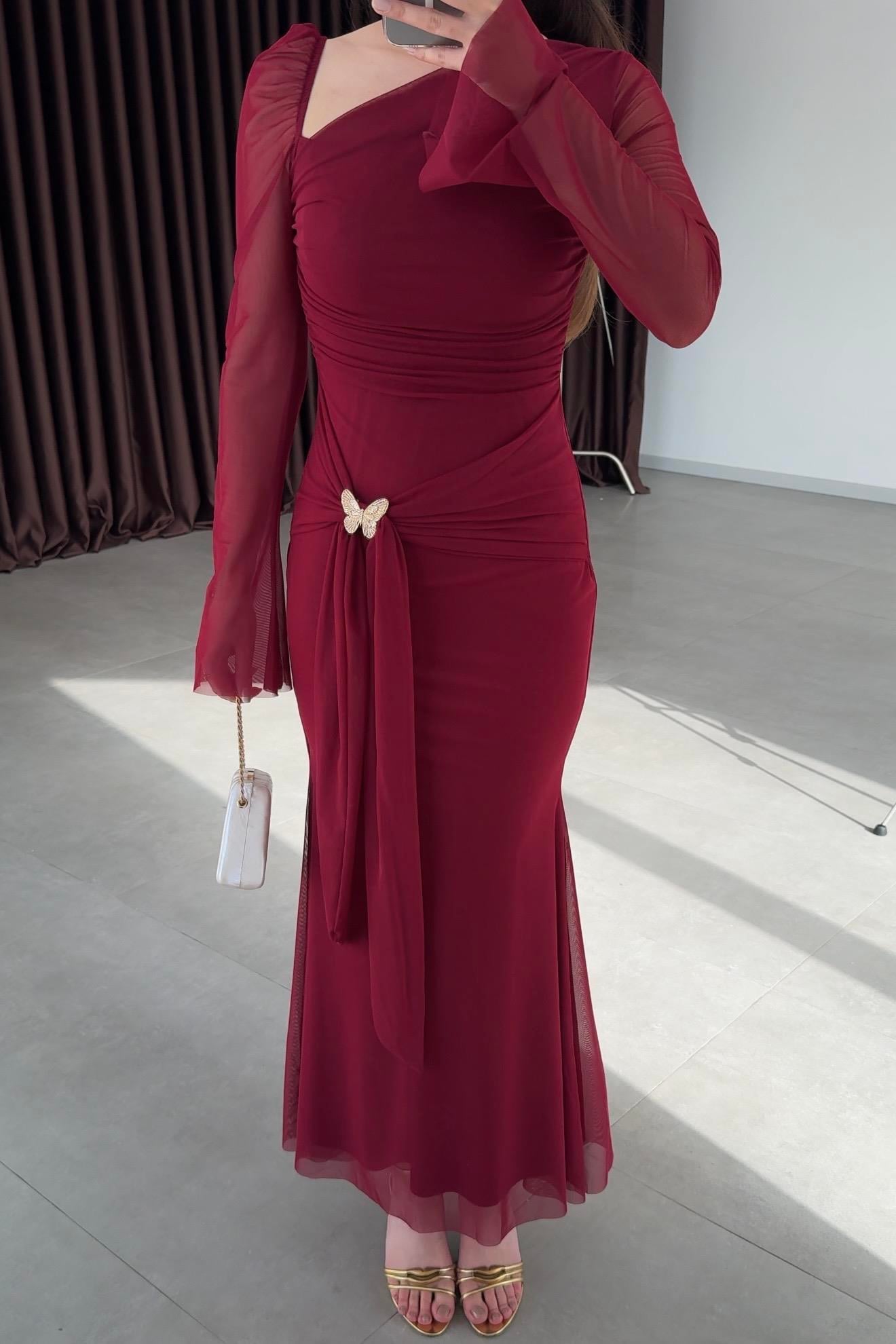 Kelebek Broş Detaylı Elbise- Bordo