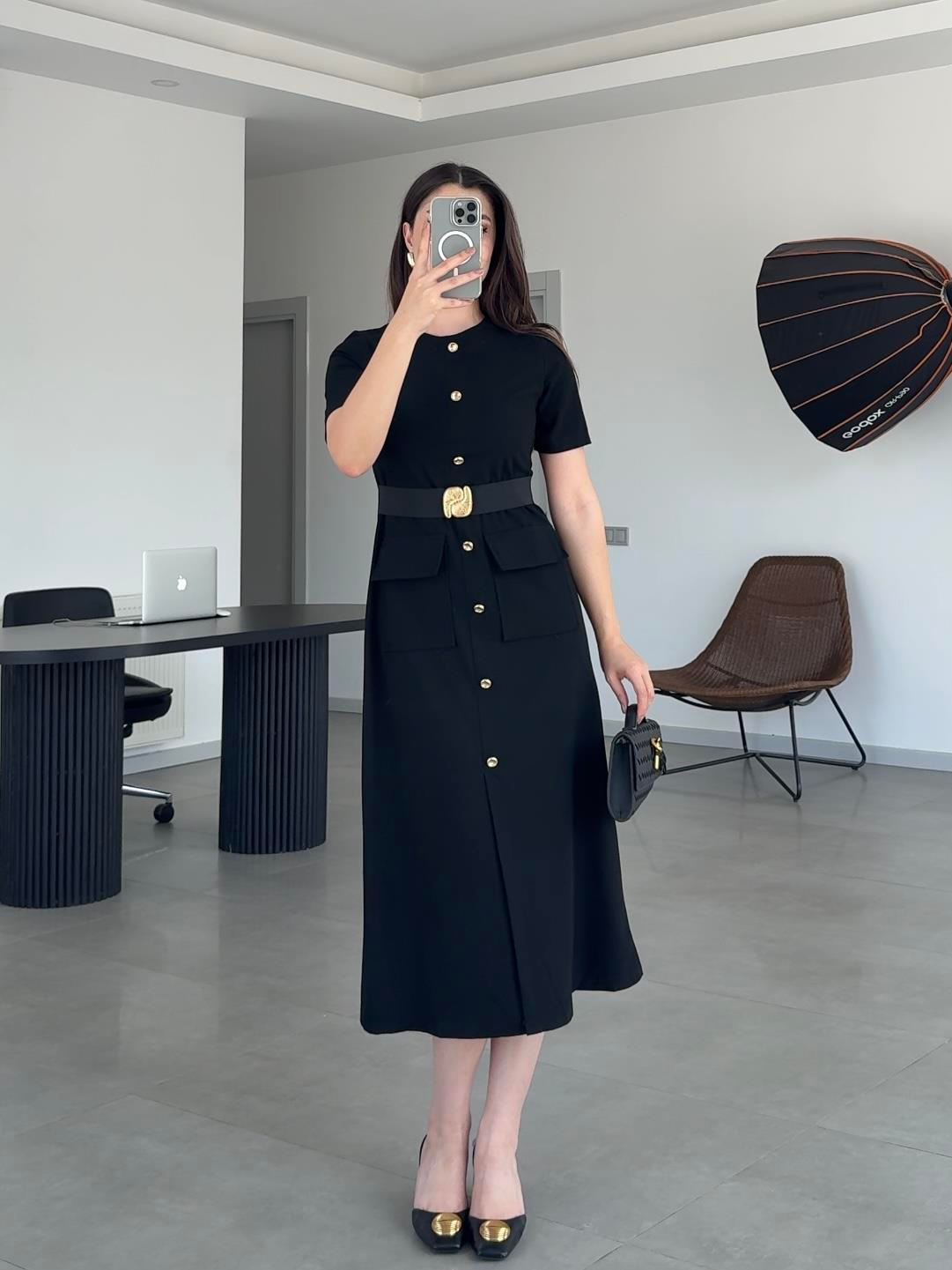 KEMERLİ ÖNDEN SÜS AKSESUARLI VE CEPLİ ELBİSE- Siyah
