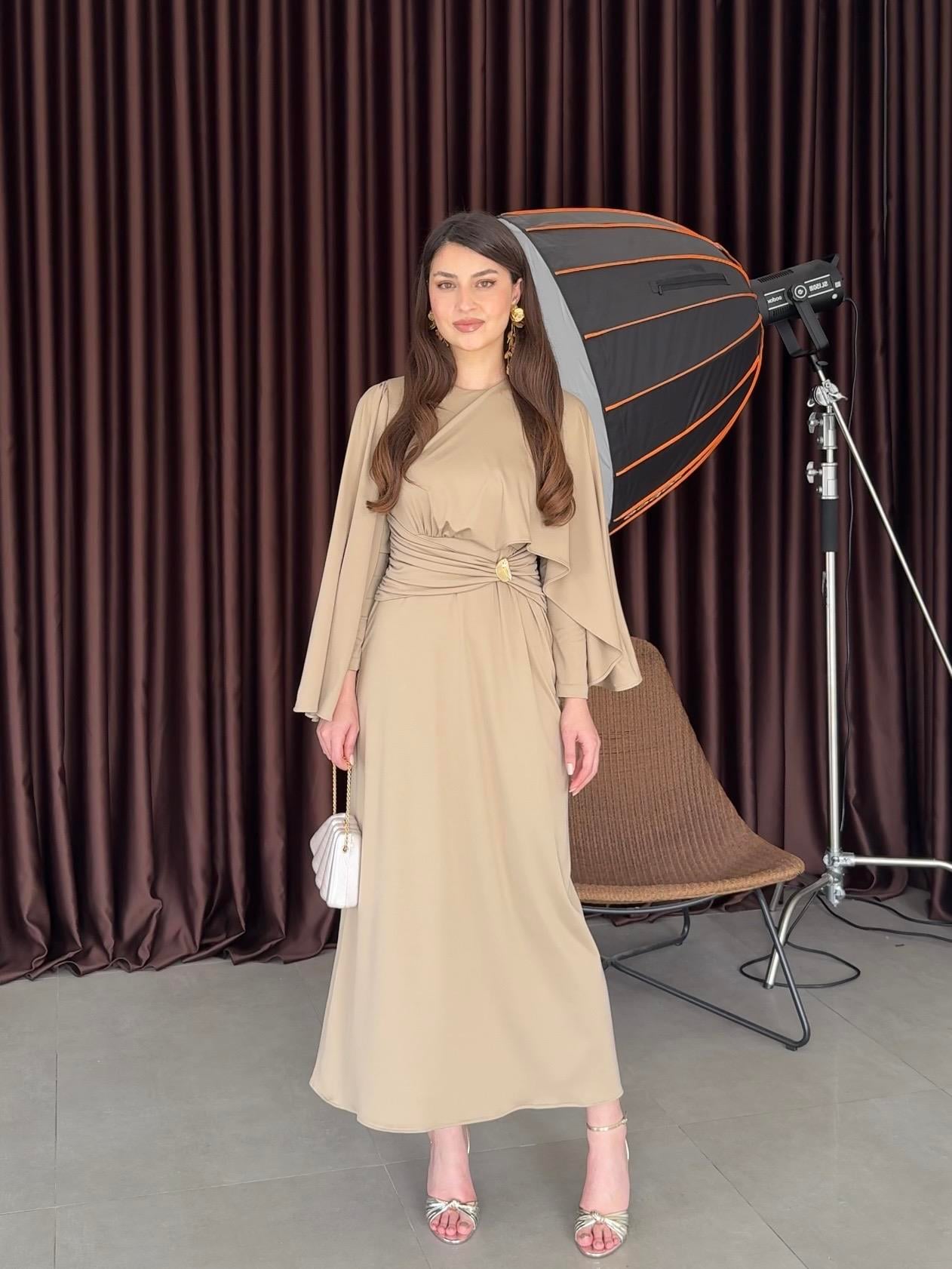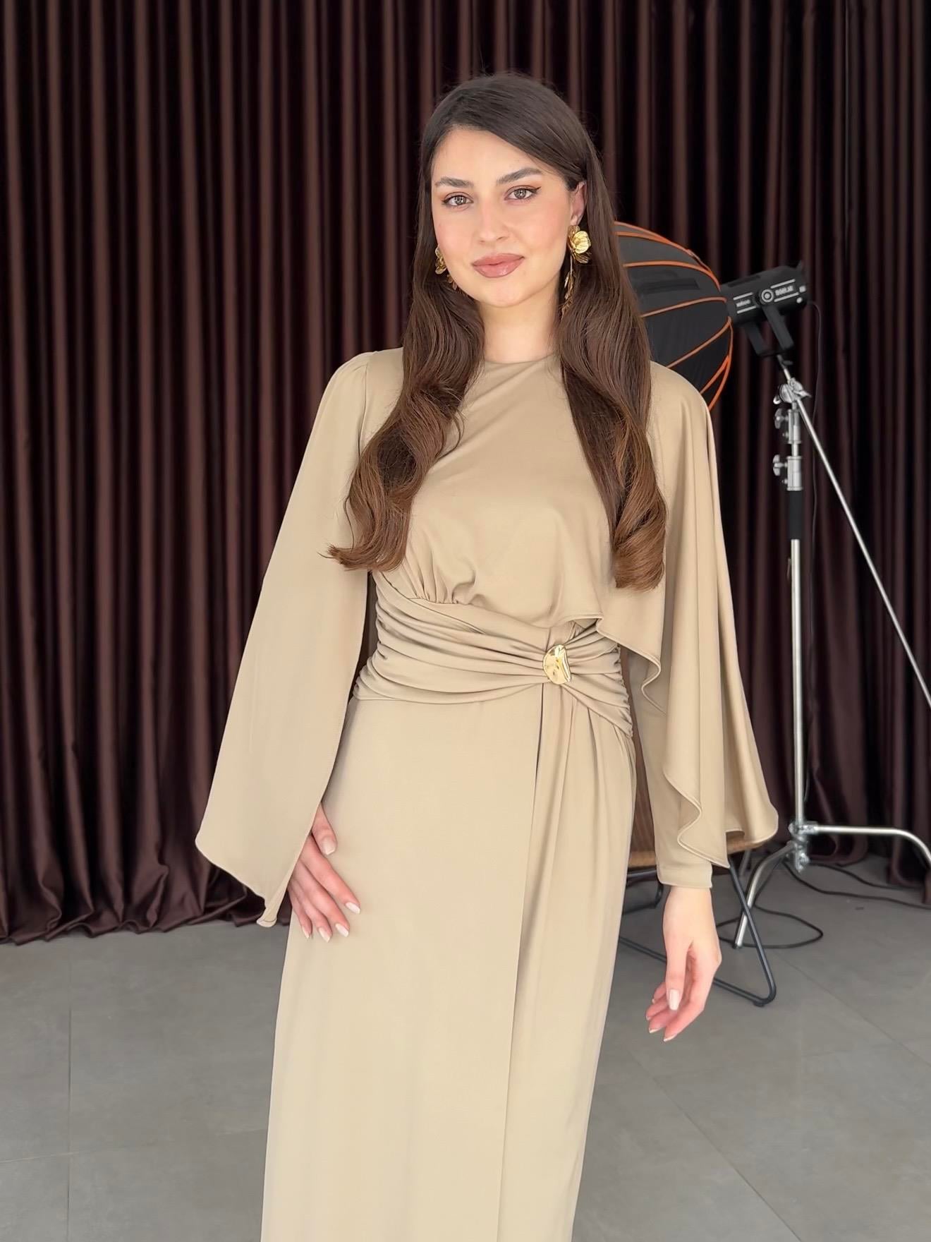 Yuvarlak yaka, arkası düğmeli, uzun kollu, pelerin detaylı, çıkarılabilir gold broşu dahildir.