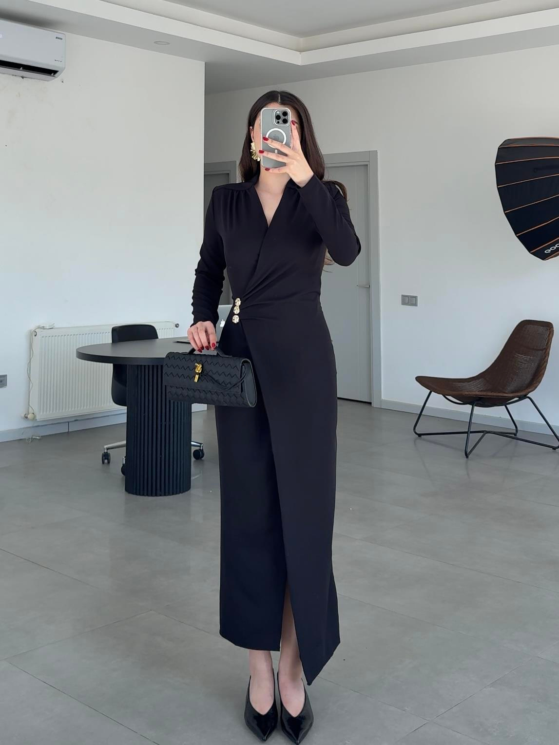 Drapeli Gold Düğme Detaylı Uzun Elbise, şık ve modern tasarımıyla dikkat çeker, uzun kollu yapısı, ön kısmındaki gold düğme detaylarıyla zarif bir görünüm sunar.