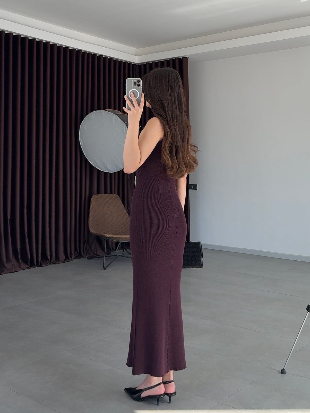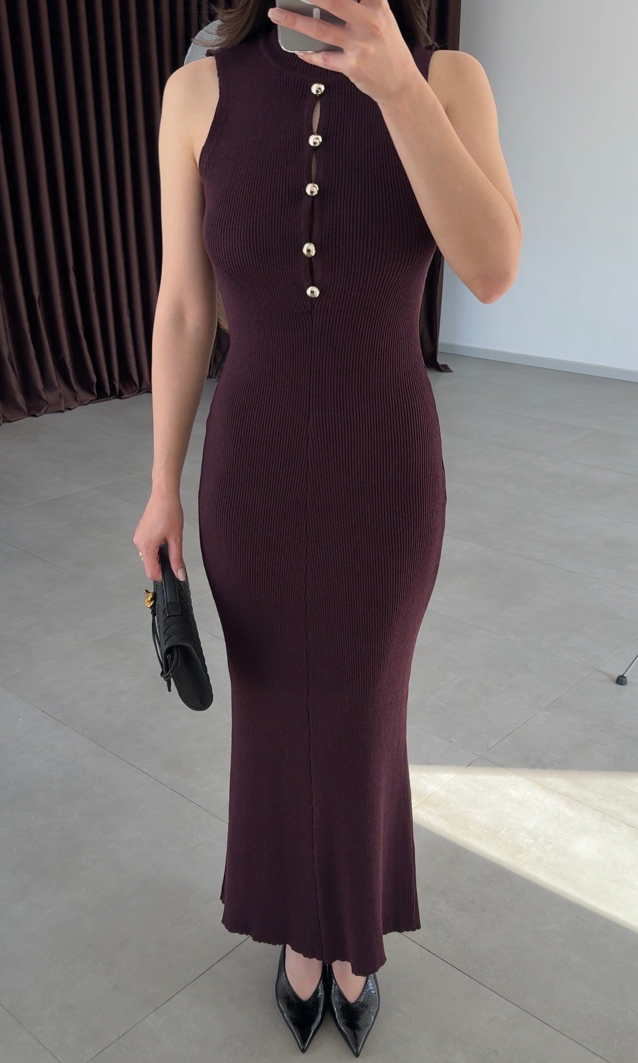 Zarif çizgileri ve vücudu saran fitilli dokusuyla öne çıkan bu kolsuz triko elbise, minimal şıklığı sevenlerin favorisi olmaya aday. Ön kısmındaki metal düğme detayları elbiseye modern ve sofistike bir hava katarken, midi boy kesimiyle hem gündüz hem gece kombinlerine uyum sağlar.
