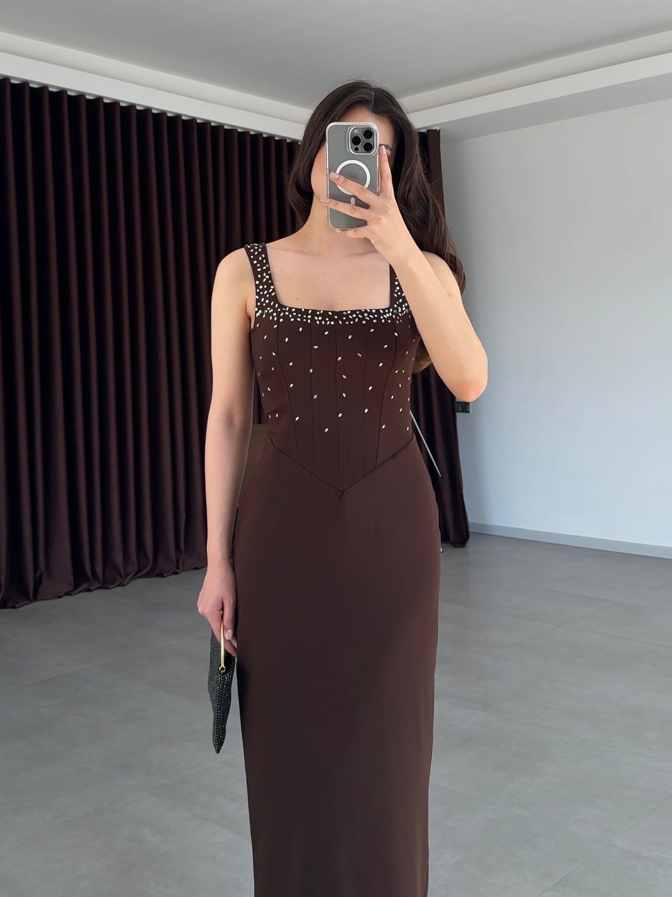Romane Taşlı Tasarım Elbise- Kahve