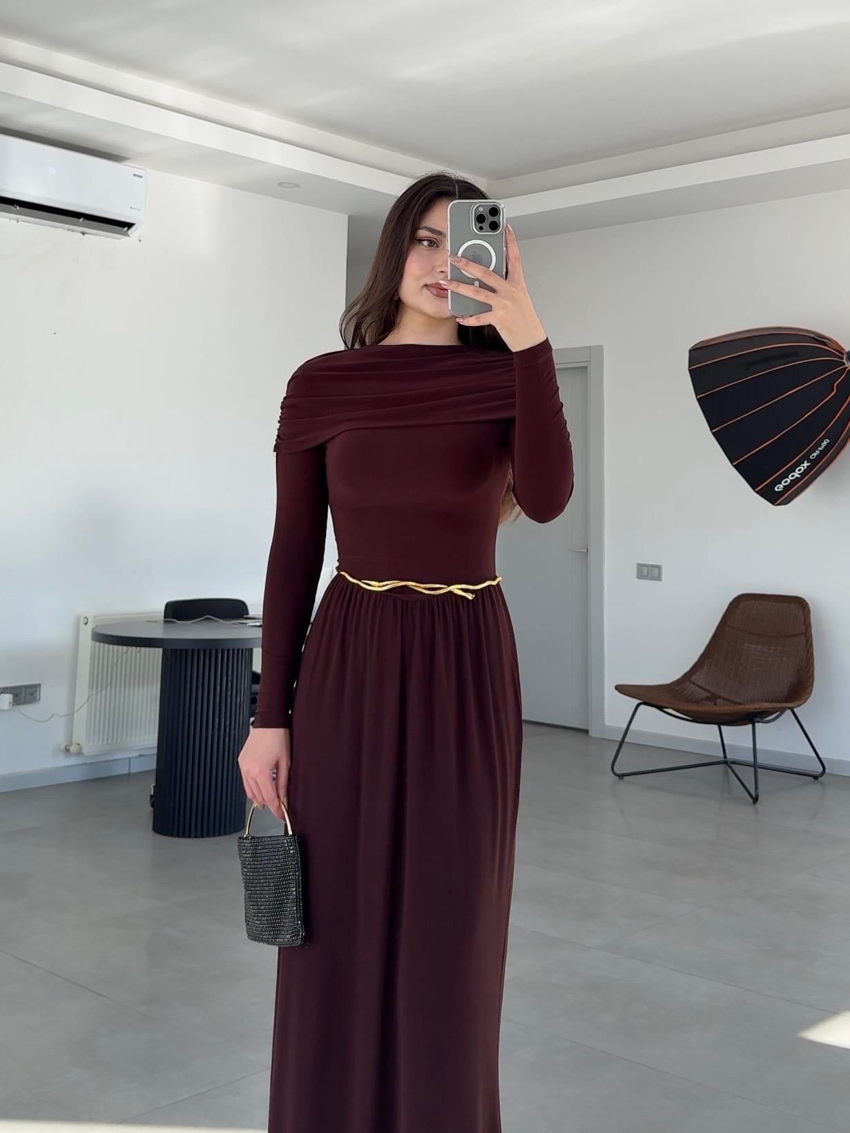 Acı Kahve, Şal Yaka Gold Metal Kemerli(Yılan Fiğürlü) Maxi Uzun Premium Büzgülü Elbise.