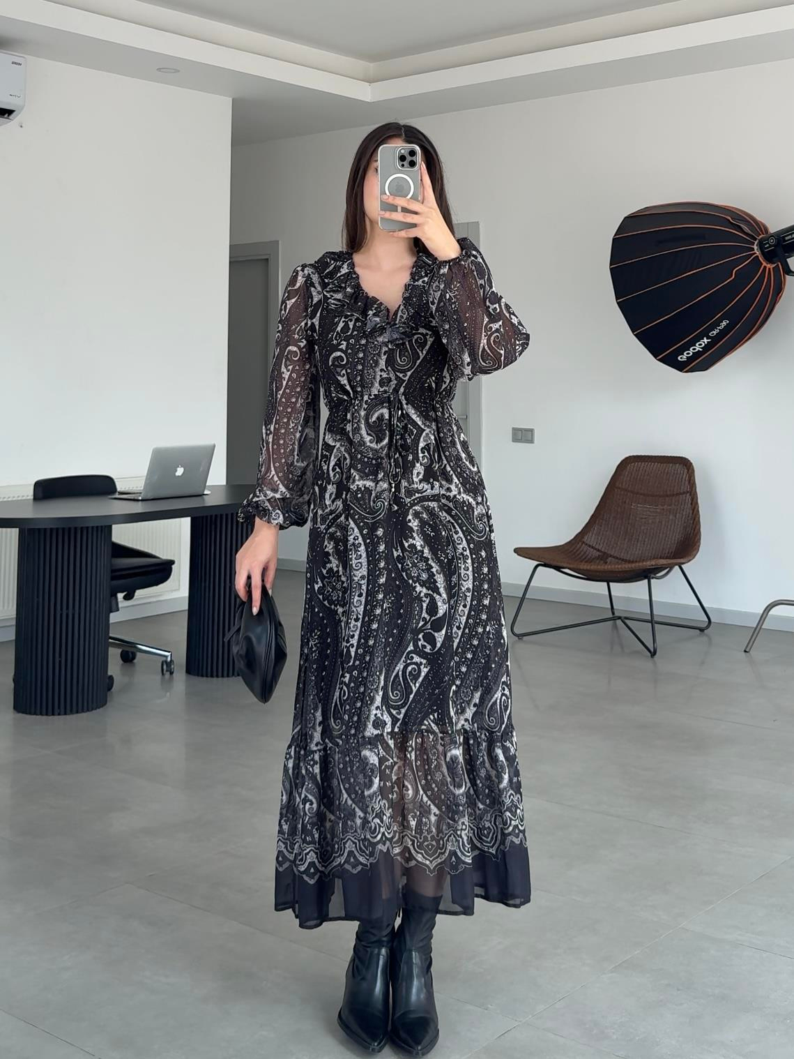 SİYAH ETNİK DESENLİ VOLAN YAKA ELBİSE