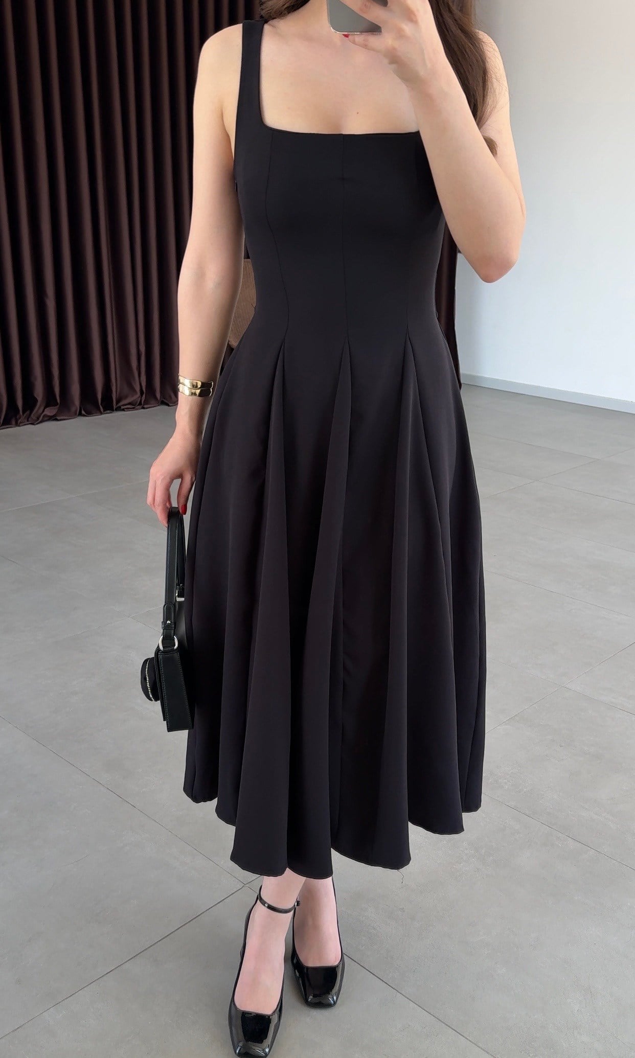 Siyah Kare Yaka Arkadan Bağlama Detaylı Elbise